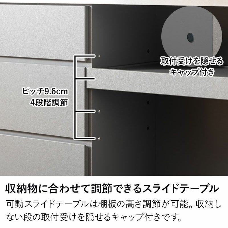 スライドテーブルは、収納したい物の高さに合わせて棚板の高さ調節が可能です。