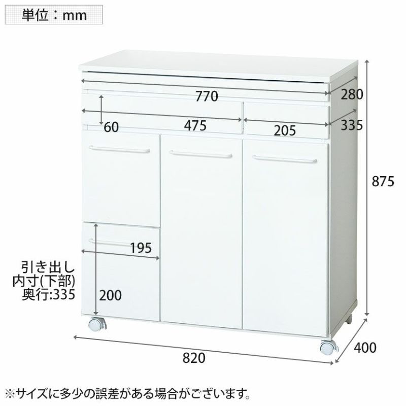| サイズ(その他) | スライド棚有効内寸 / 幅770×奥行280mm 引き出し内寸(上部(大)) / 幅475×奥行335×高さ60mm 引き出し内寸(上部(小)) / 幅205×奥行335×高さ60mm 引き出し内寸(下部) / 幅195×奥行335×高さ200mm(1杯あたり) |