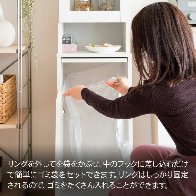 ●リングを外して袋をかぶせ、中のフックに引っかけるだけで簡単にゴミ袋をセットできます。