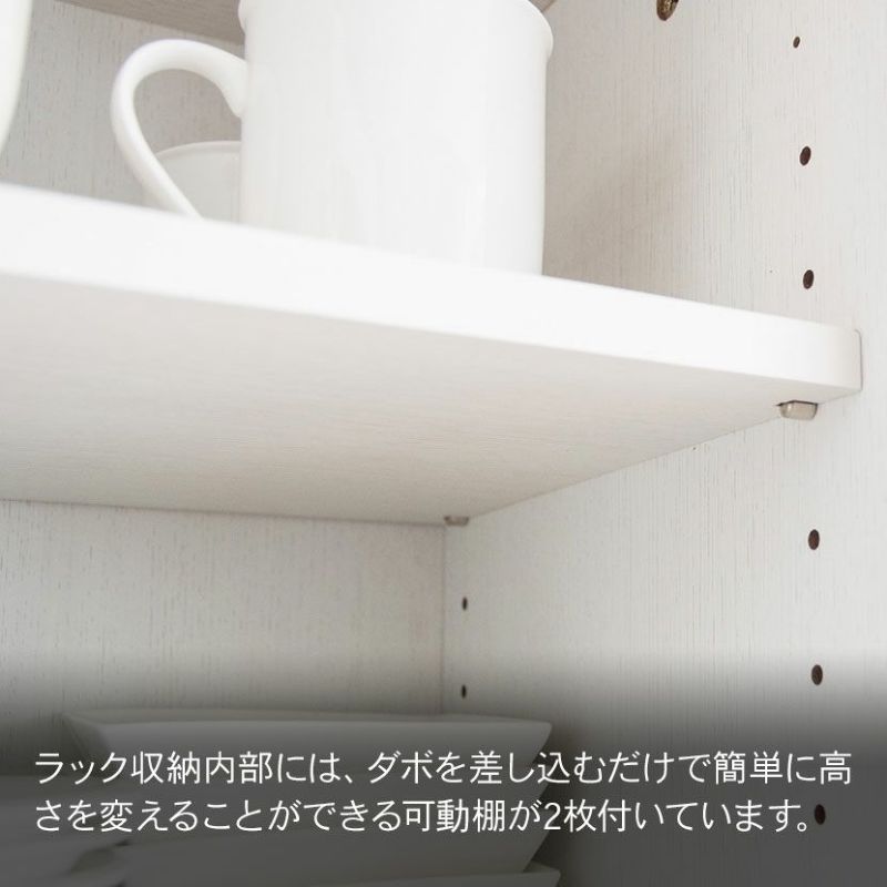 ●ラック収納内部には、ダボを差し込むだけで簡単に高さを変えることができる可動棚が2枚付いています。