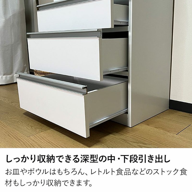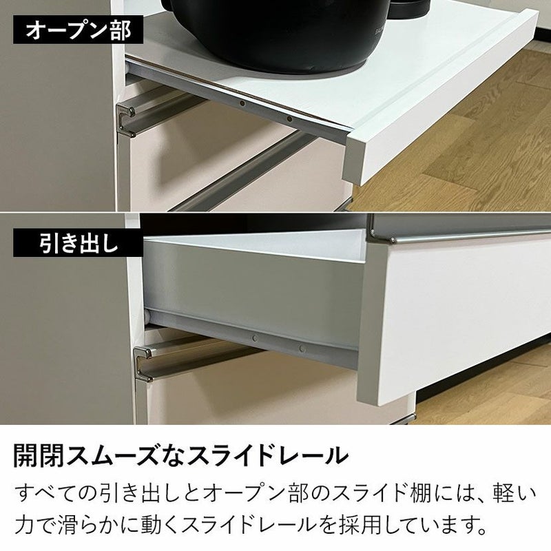 すべての引き出しとオープン部のスライド棚には、軽い力で滑らかに動くスライドレールを採用しています。