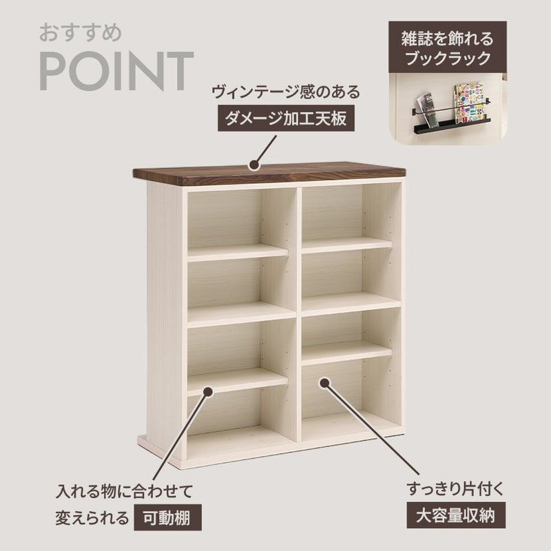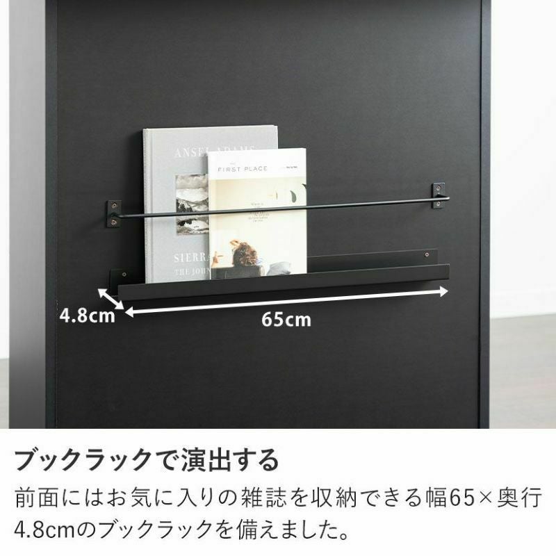 前面にはお気に入りの雑誌を収納できる幅65×奥行4.8cmのブックラックを備えました。