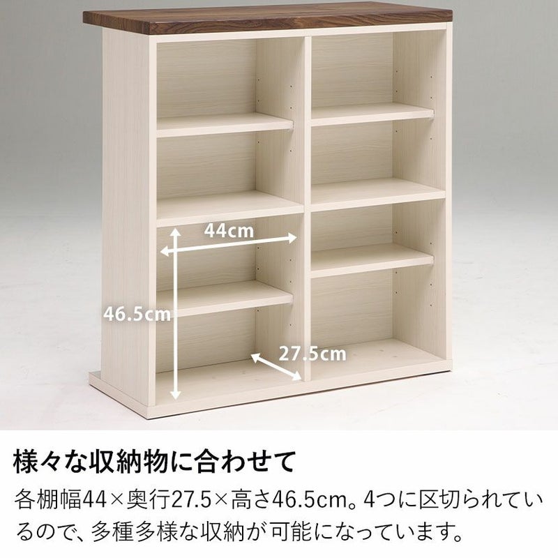 各棚幅44cm×奥行27.5×高さ46.5cm。4つに区切られているので、多種多様な収納が可能になっています。