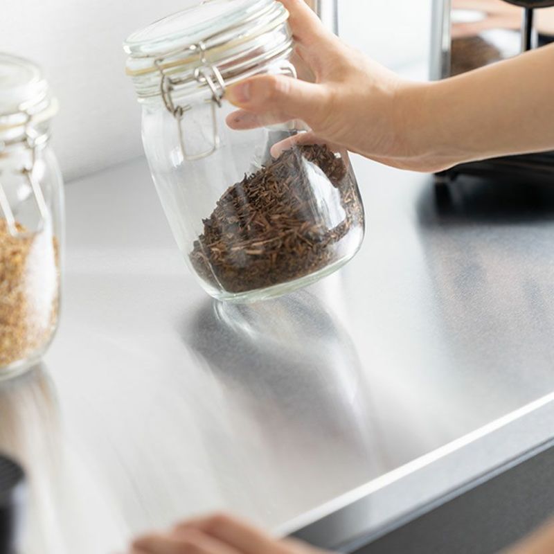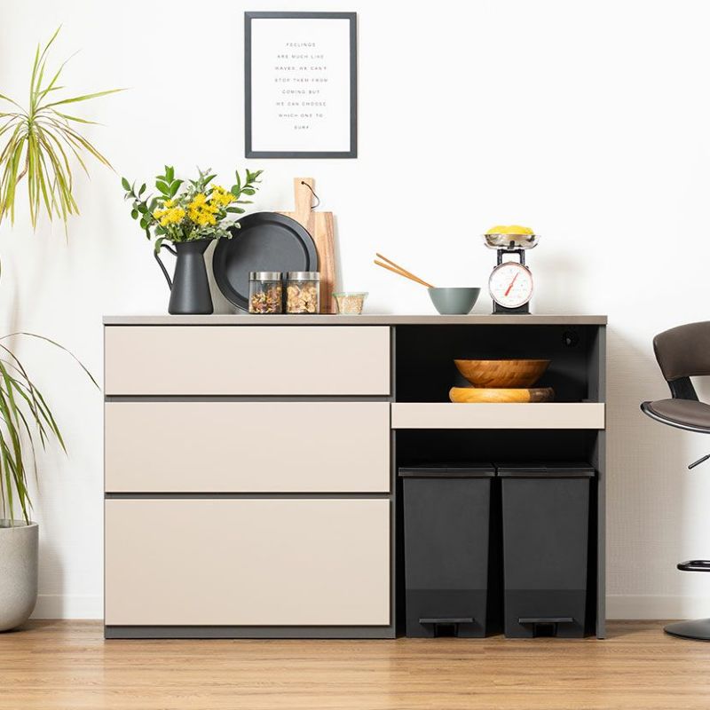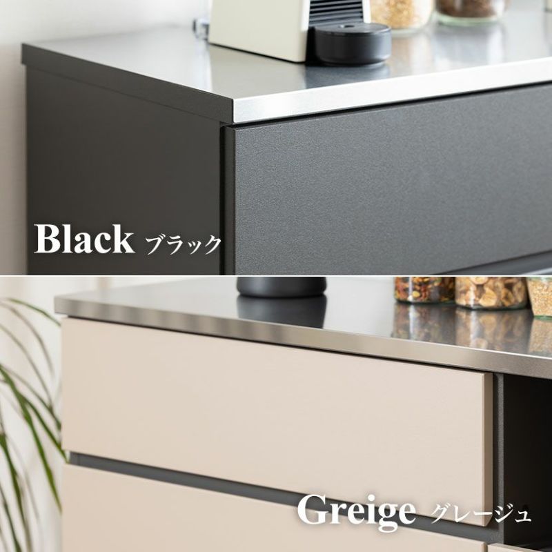 カトラリーなどの小物整理に便利な浅型から、保存食や高さのある調味料ボトルも収納しやすい深型の引き出しまで、用途に合わせて使い分けられる3段構成です。