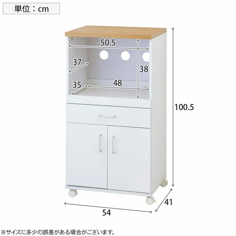 | サイズ | 外寸 / 幅540×奥行410×高さ1005mm スライド棚 / 幅480×奥行350mm 引き出し内寸 / 幅450×奥行335×高さ65(85)mm 扉内内寸 / 幅500×奥行370×高さ380mm