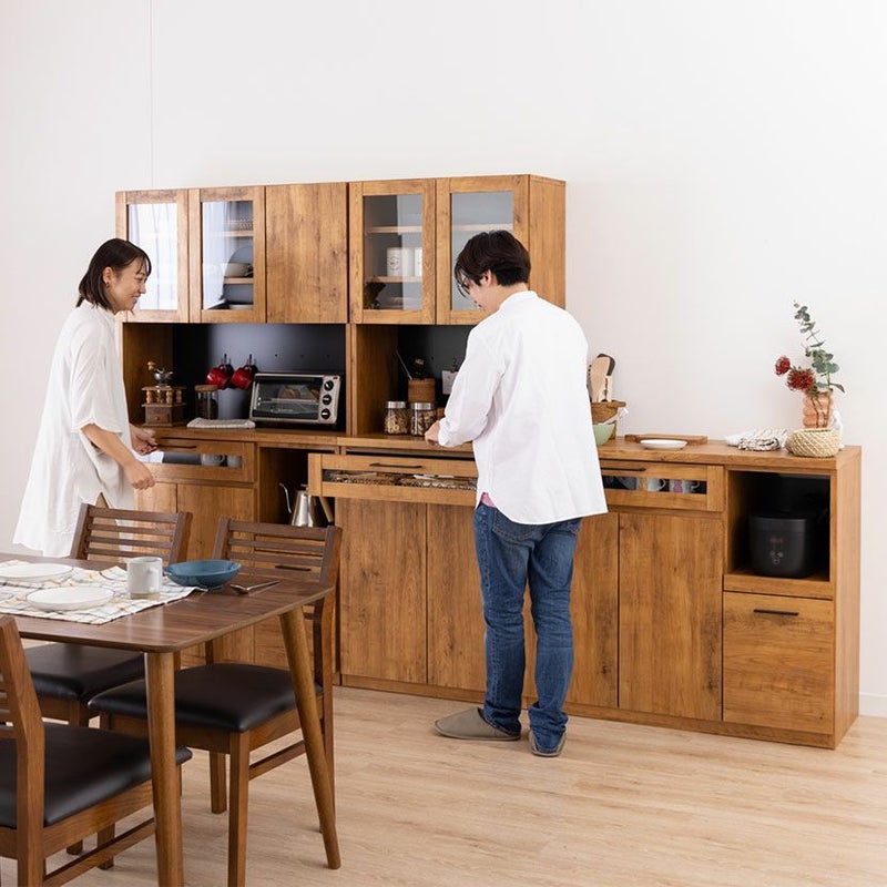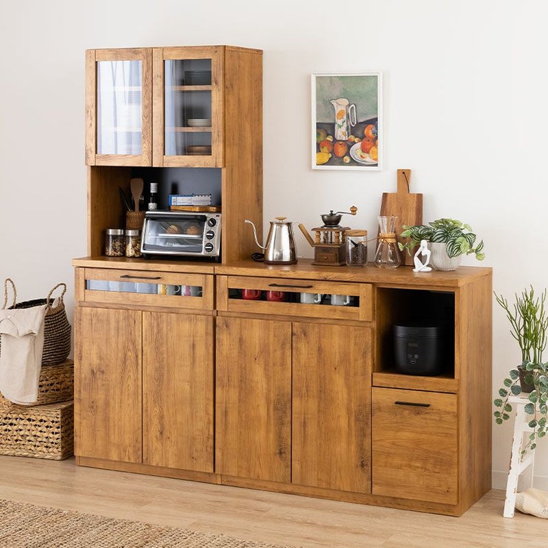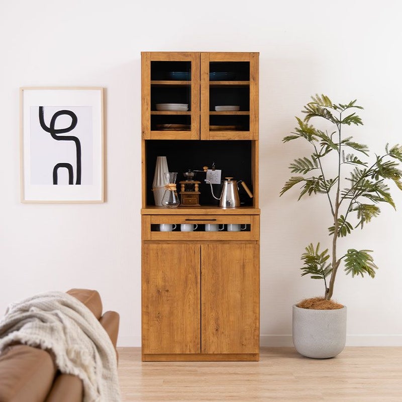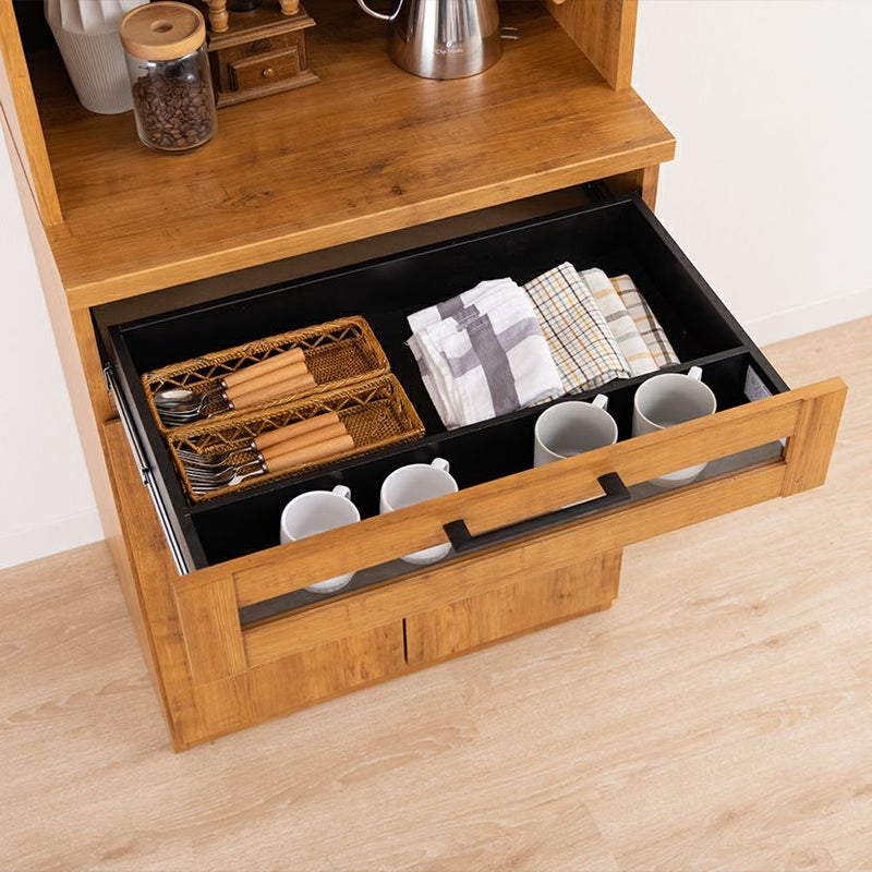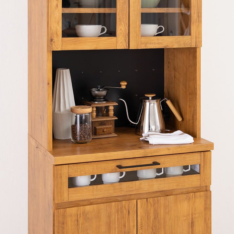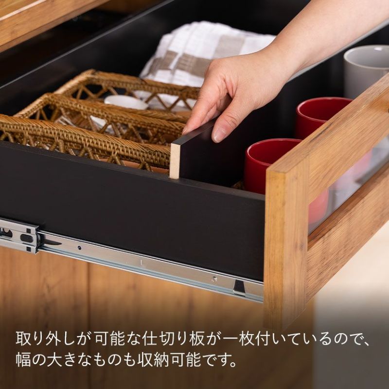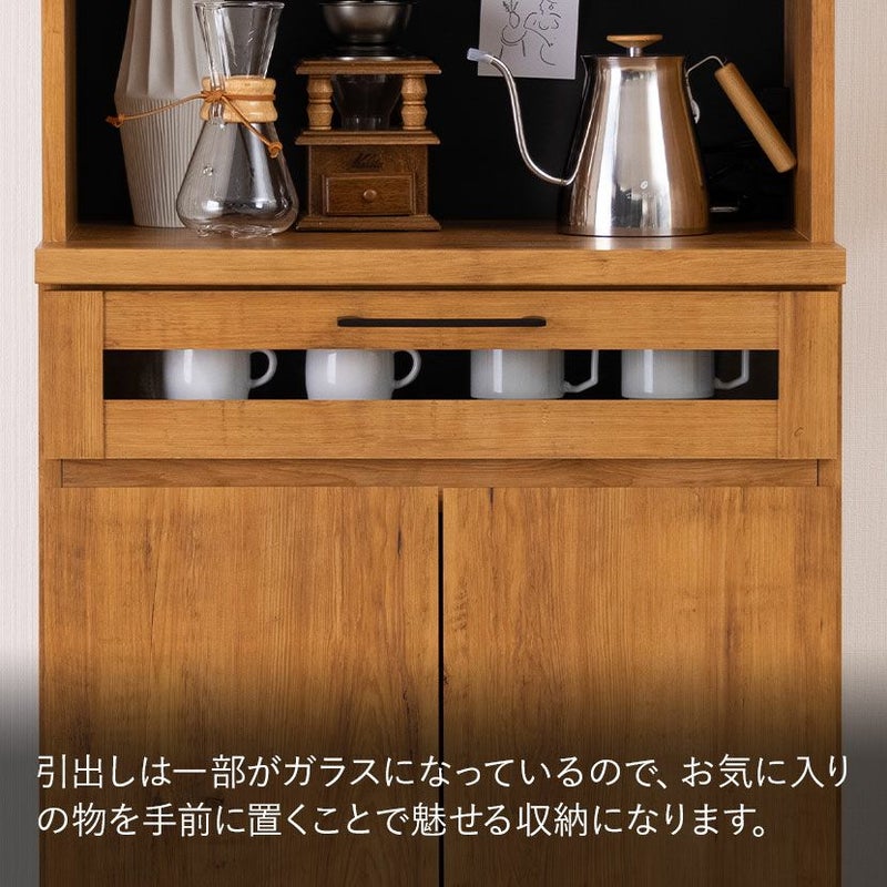 引き出しの前板は一部がガラスになっており、お気に入りのカップなどを入れて見せる収納を楽しめます。