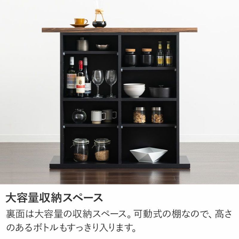 裏面は大容量の収納スペース。可動式の棚なので、高さのあるボトルもすっきり入ります。