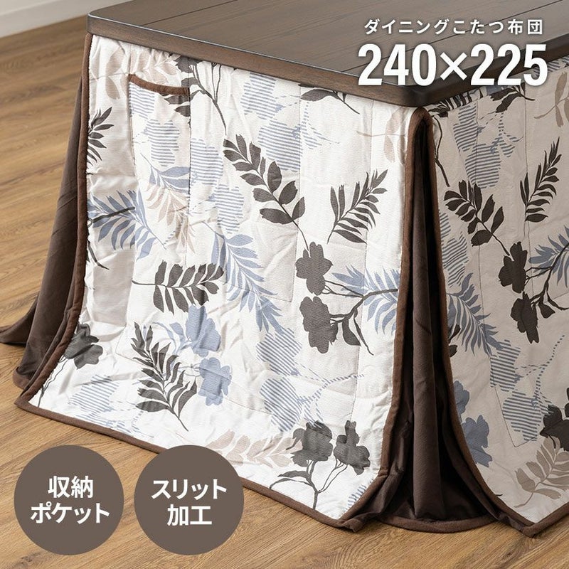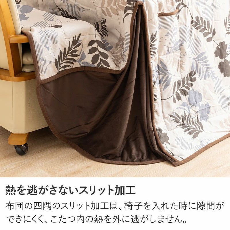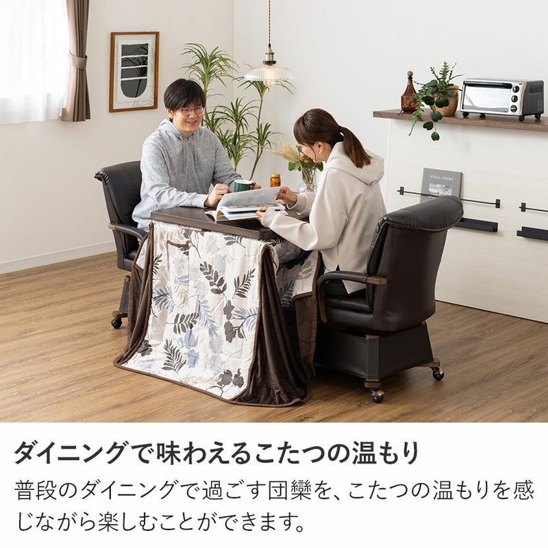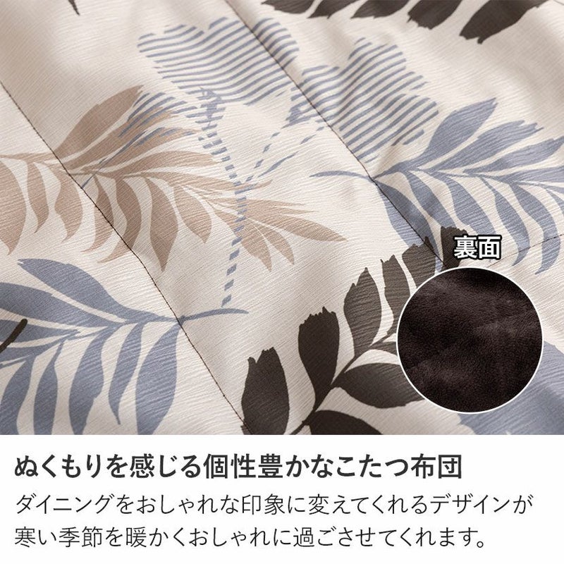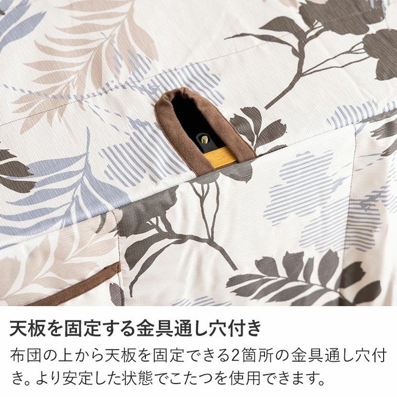 <こたつ布団>●ダイニングで味わえるこたつの温もり普段のダイニングで過ごす団欒を、こたつの温もりを感じながら楽しむことができます。●ぬくもりを感じる個性豊かなこたつ布団お部屋をおしゃれな印象に変えてくれるデザインが、寒い季節を暖かくおしゃれに過ごさせてくれます。●高い保温性表はさらりとした生地ですが、裏は温かく保温性の高い生地を使用しています。●天板を固定する金具通し穴付き布団の上から天板を固定できる2箇所の金具通し穴付き。より安定した状態でこたつを使用できます。●熱を逃がさないスリット加工布団の四隅のスリット加工は、椅子を入れた時に隙間ができにくく、こたつ内の熱を外に逃がしません。●ポケットとコード通し穴で足元すっきりスリットの上部には電源コードが通せる穴が、布団上部にはスイッチが収納できるポケットが付いています。