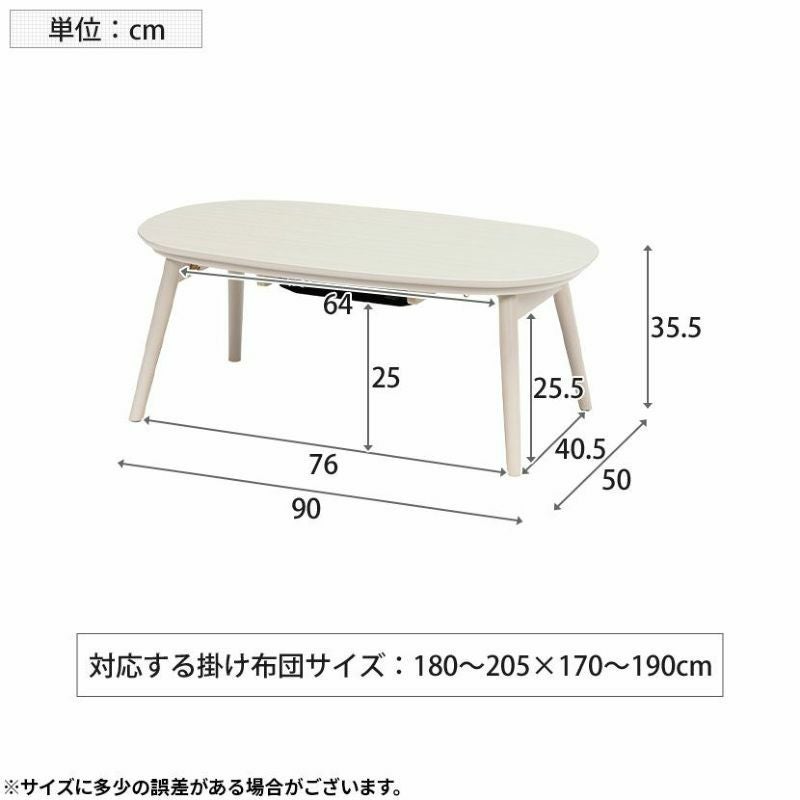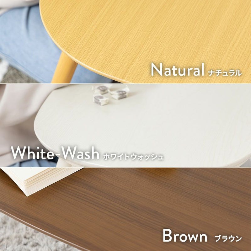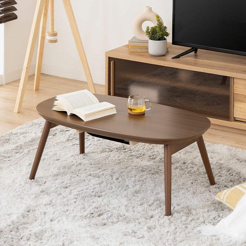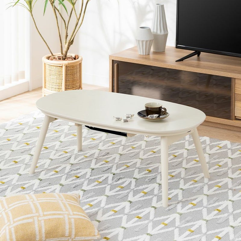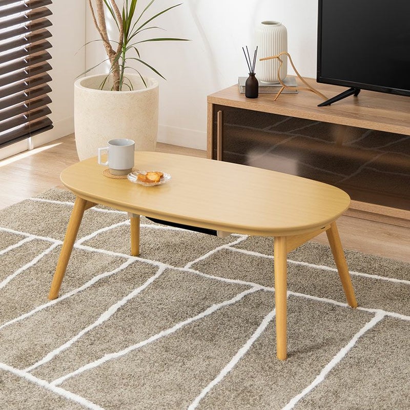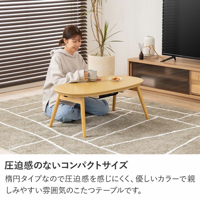 楕円タイプなので圧迫感を感じにくく、優しいカラーで親しみやすい雰囲気のこたつテーブルです。