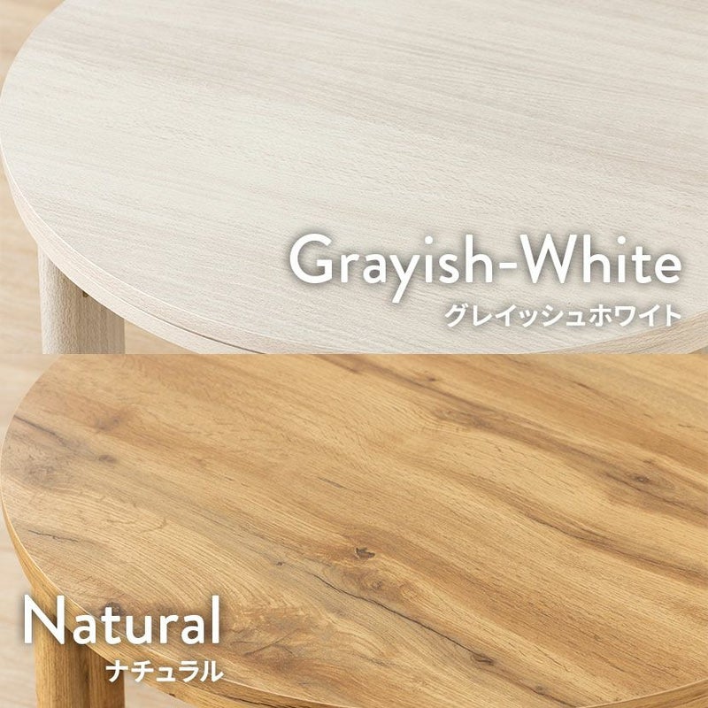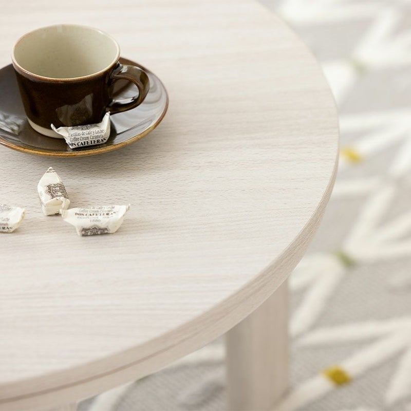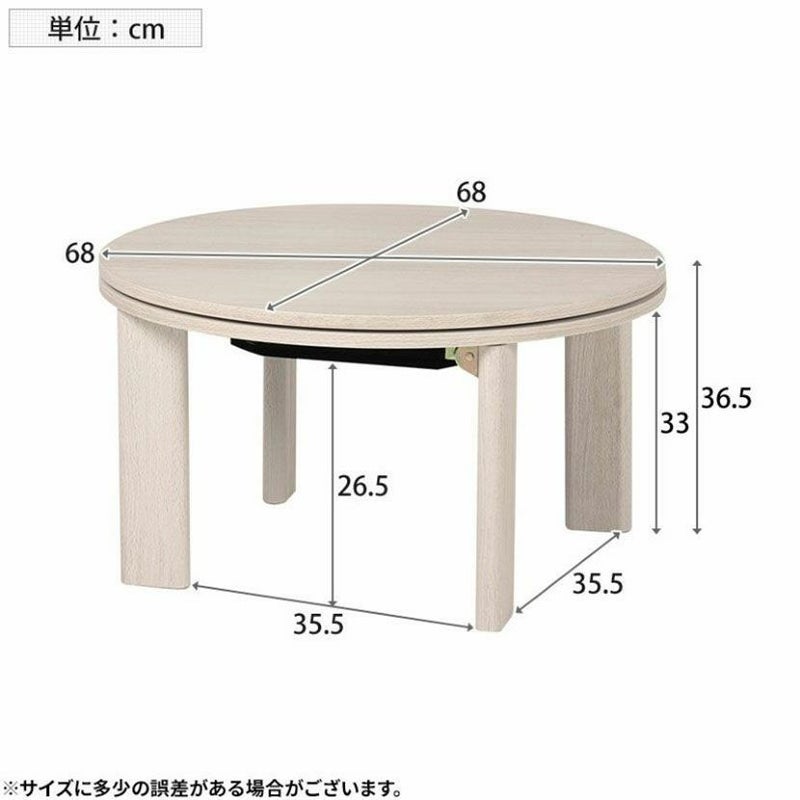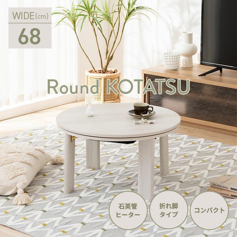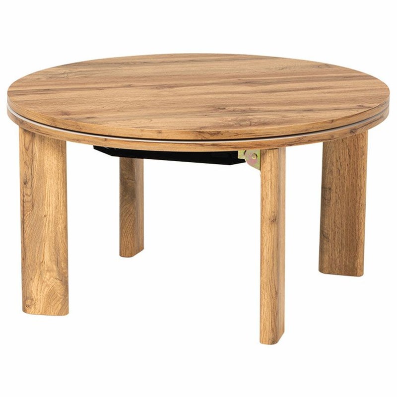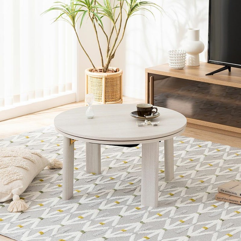 丸形の天板は圧迫感が少なく、やさしいカラーが親しみやすい印象を与えるこたつテーブルです。