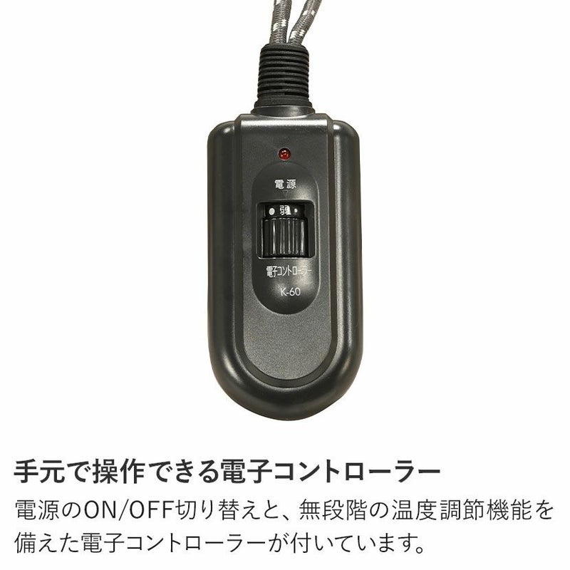 電源のON/OFF切り替えと、無段階の温度調節機能を備えた電子コントローラーが付いています。