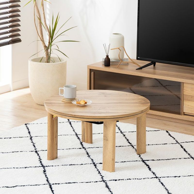 丸形の天板は圧迫感が少なく、やさしいカラーが親しみやすい印象を与えるこたつテーブルです。