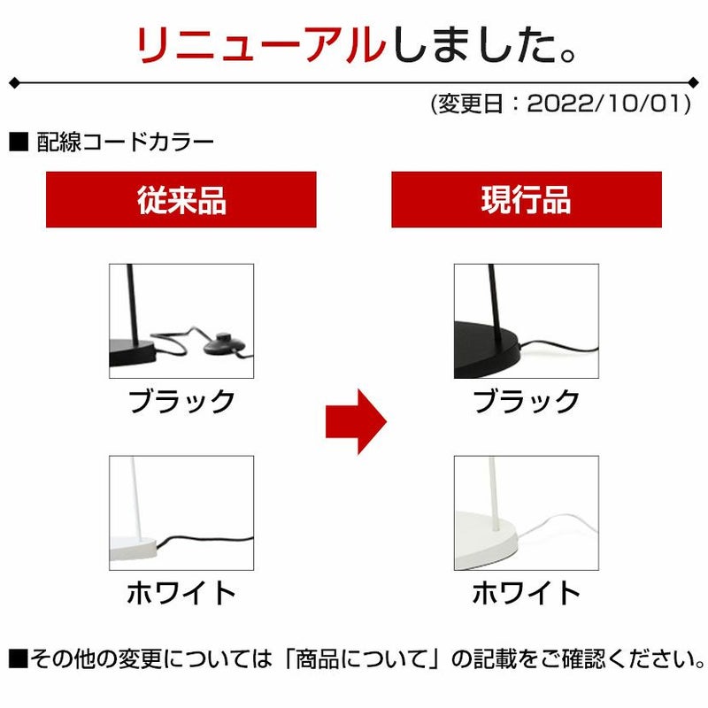 | 変更点 | ・サイズ(外寸):幅275×奥行160×高さ1300mm⇒幅270×奥行170×高さ1290mmに変更 ・重量:2.5kg⇒3kgに変更 ・梱包サイズ:幅1350×奥行340×高さ250mm⇒幅1360×奥行350×高さ205mmに変更 ・梱包重量:5kg⇒4.5kgに変更 ・配線コードカラー:本体色と同色に変更 (変更日:2022年10月1日) |