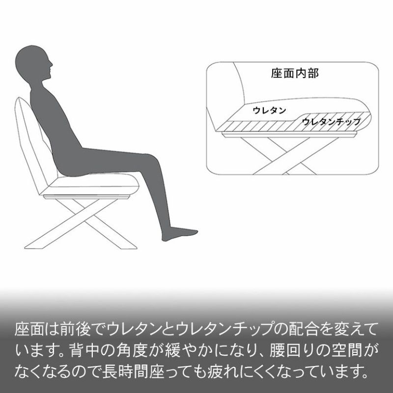 ●座面は前後でウレタンとウレタンチップの配合を変えています。背中の角度が緩やかになり、腰回りの空間がなくなるので長時間座っても疲れにくくなっています。