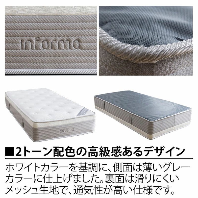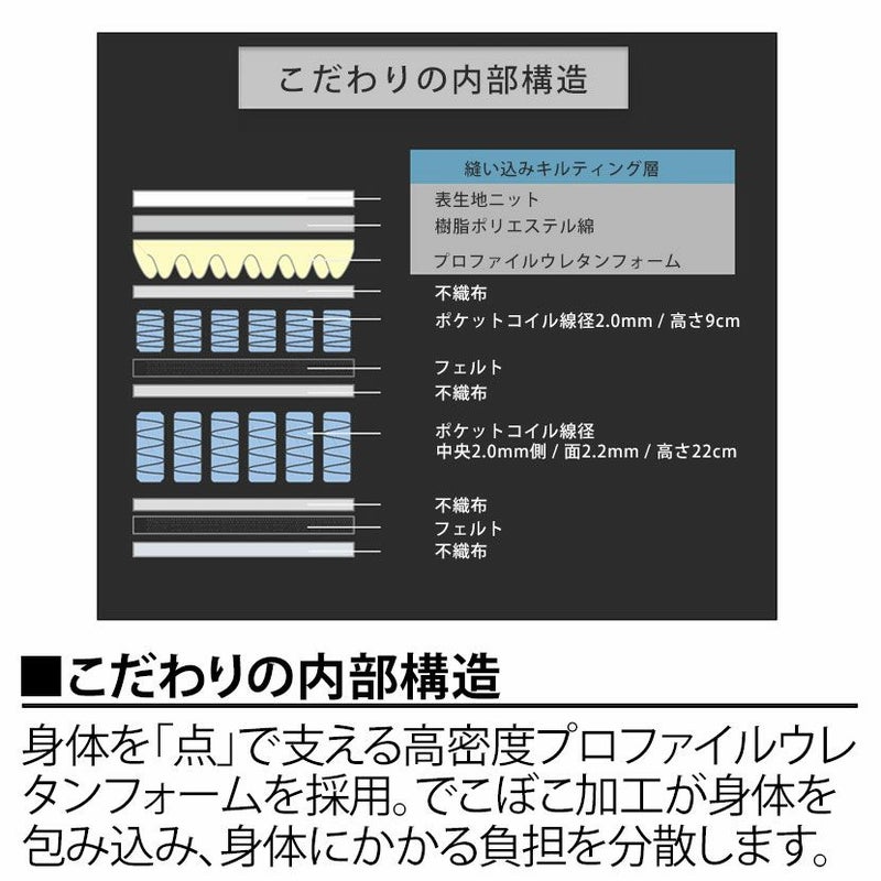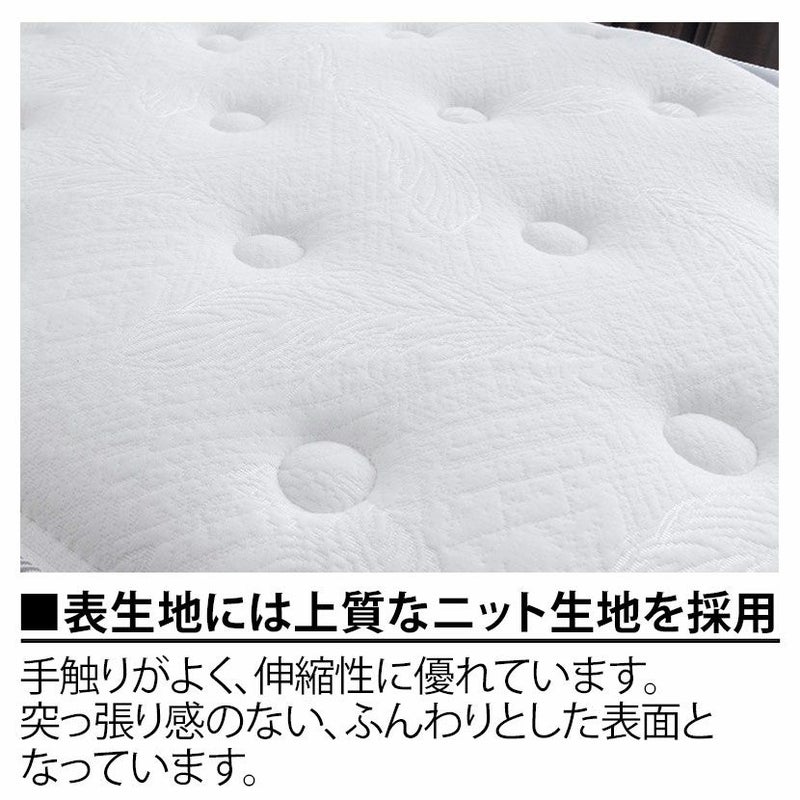 | 備考 | エッジサポート構造 Wコイルスプリング構造 ポケットコイル線径(上段・下段) / 中央2mm、側面2.2mm 表面 / 縫い込みキルティング加工 |