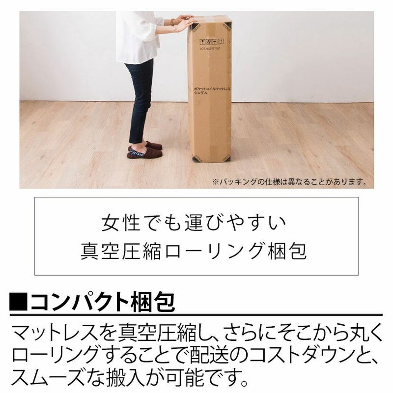 | 備考 | エッジサポート構造 Wコイルスプリング構造 ポケットコイル線径(上段・下段) / 中央2mm、側面2.2mm 表面 / 縫い込みキルティング加工 |