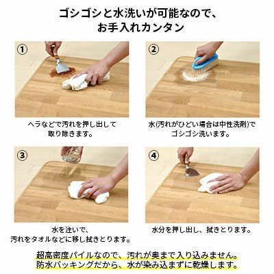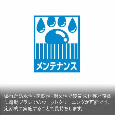 PVCバッキングを使用しているので、汚れてしまっても敷いたまま水洗いをすることができます。ブラシでゴシゴシ洗ってもへたりにくいので、長い間綺麗な状態を保つことが可能です。ペットの抜け毛が舞い上がりにくいので、お掃除も簡単です。