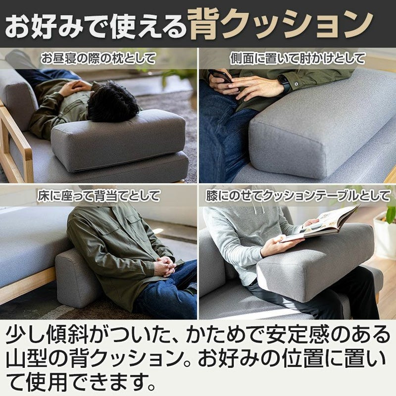 ・3つに分割された背クッションは自由な位置に配置が可能で、肘掛けのように使用したりまくら代わりにすることも可能です。