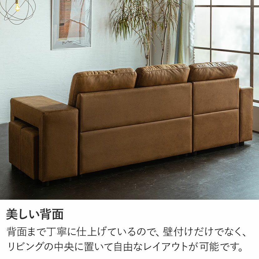片肘部分に2段の棚、カウチ部分の座面下に収納スペースが付いています。