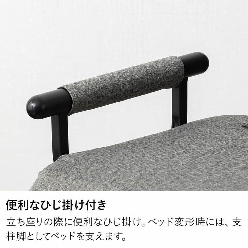 立ち座りの際に便利なひじ掛け。ベッド変形時には、支柱脚としてベッドを支えます。