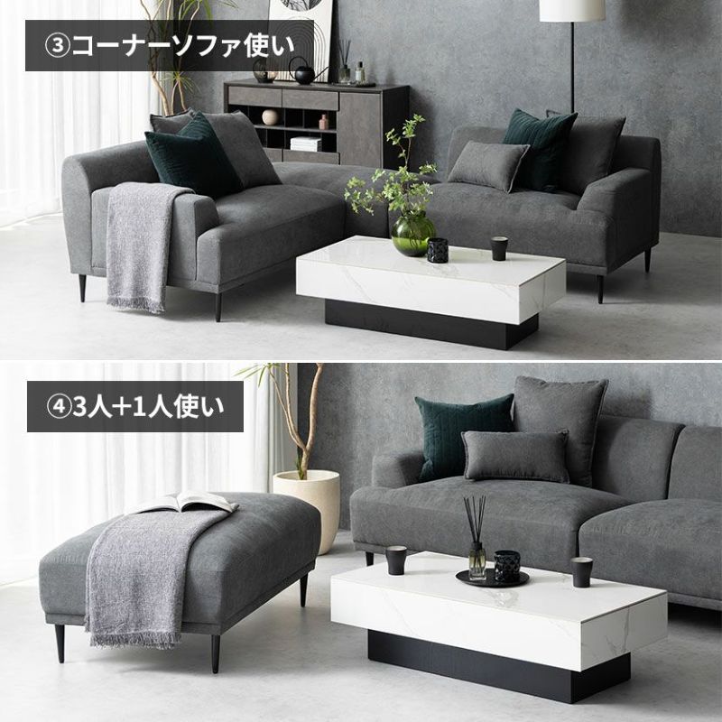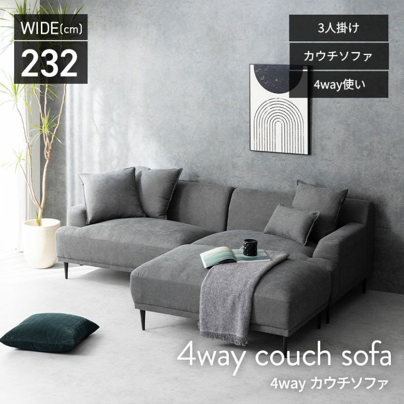 レイアウト次第で4通りの使い方が楽しめるカウチソファ。ゆったり座れる贅沢なワイドサイズ設計です。