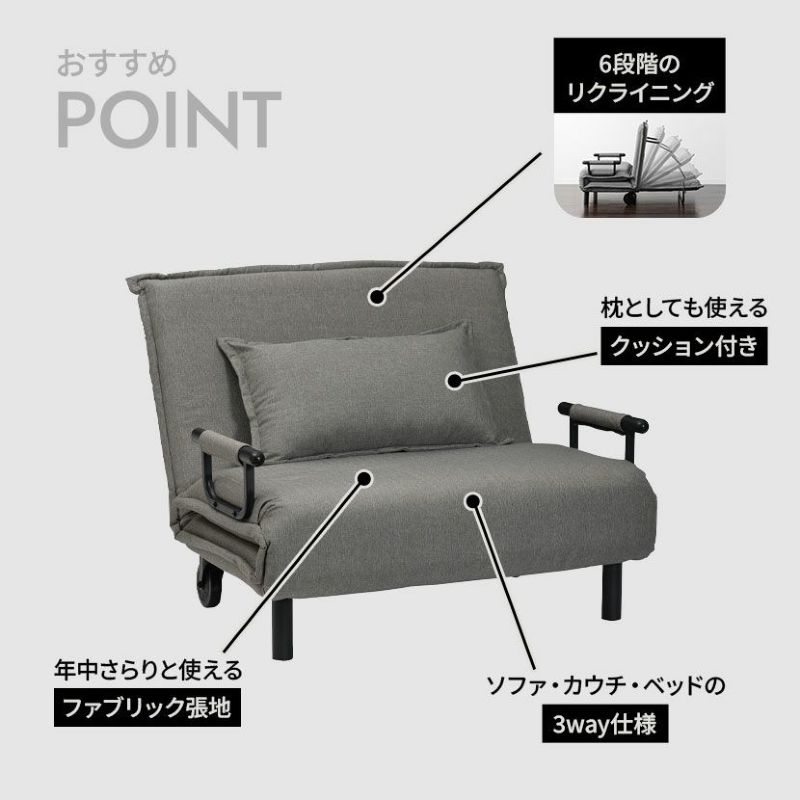 ワンルームや客室にもぴったりなコンパクトサイズのソフアベッド。 6段階調節のリクライニング機能付きです。