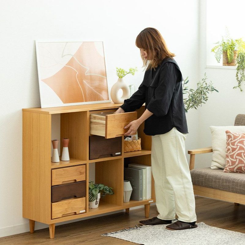 ※突板とは、板の表面にスライスした天然木を貼り付けたものちょっとした作業台としても高さが97cmと女性でも使いやすいサイズ感なので、ディスプレイはもちろん作業台としてもおすすめです。しっかりとした収納力収納スペースは本や雑誌、ファイルはもちろん、お気に入り小物を飾って、魅せる収納としてもおすすめです。引き出し利用で収納力アップ別売りの専用の引き出しを利用することで、空間を上手に使うことができ、収納力もアップします。