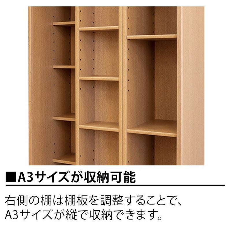 右側の棚は棚板を調整することでA3サイズが縦で収納できます。