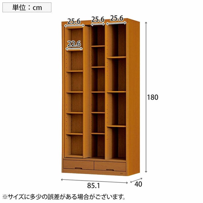 | サイズ | 外寸 / 幅851×奥行400×高さ1800mm 引き出し内寸 / 幅365×奥行323×高さ83mm 棚板(右) / 幅255×奥行354mm 棚板(左・中) / 幅255×奥行188mm 棚板(スライドボックス) / 幅225×奥行157mm 棚板厚さ / 15mm