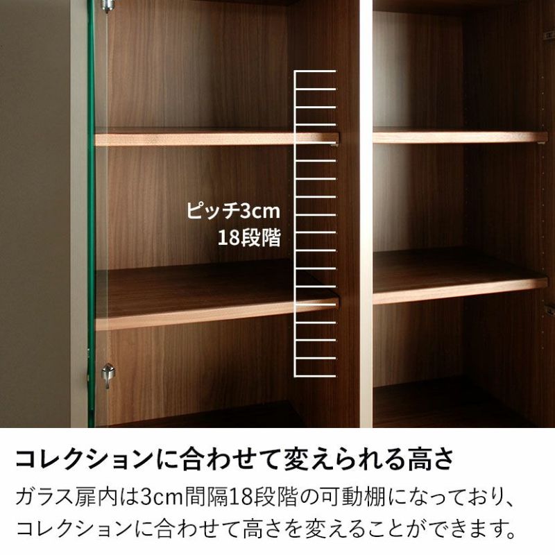 ガラス扉内は3cm間隔18段階の可動棚になっており、コレクションに合わせて高さを変えることができます。