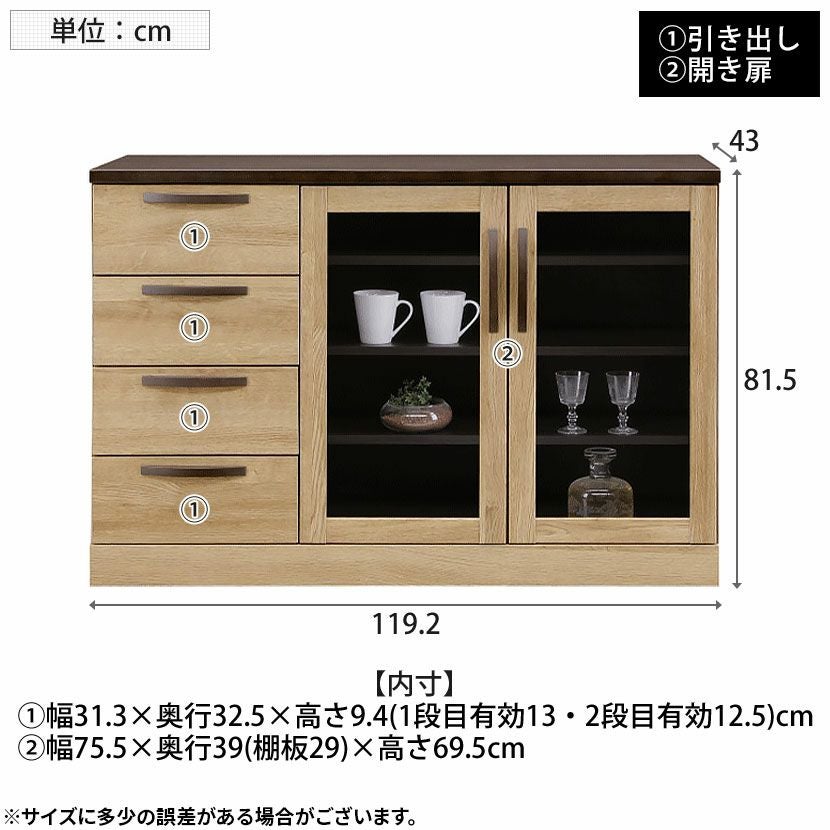 他の画像を見る 【設置無料】幅119.2cm サイドボード 木目調 引き出し 開き扉 収納 ツートン キャビネット リビングボード 収納家具 多目的収納 おしゃれ リビング シンプル ナチュラル 和モダン 送料無料 送料無料 組立設置付き 組立設置付き ¥ 49,900 税込 カートに入れる
