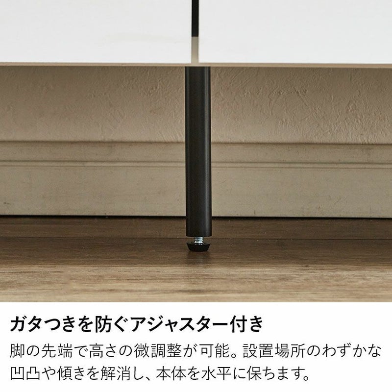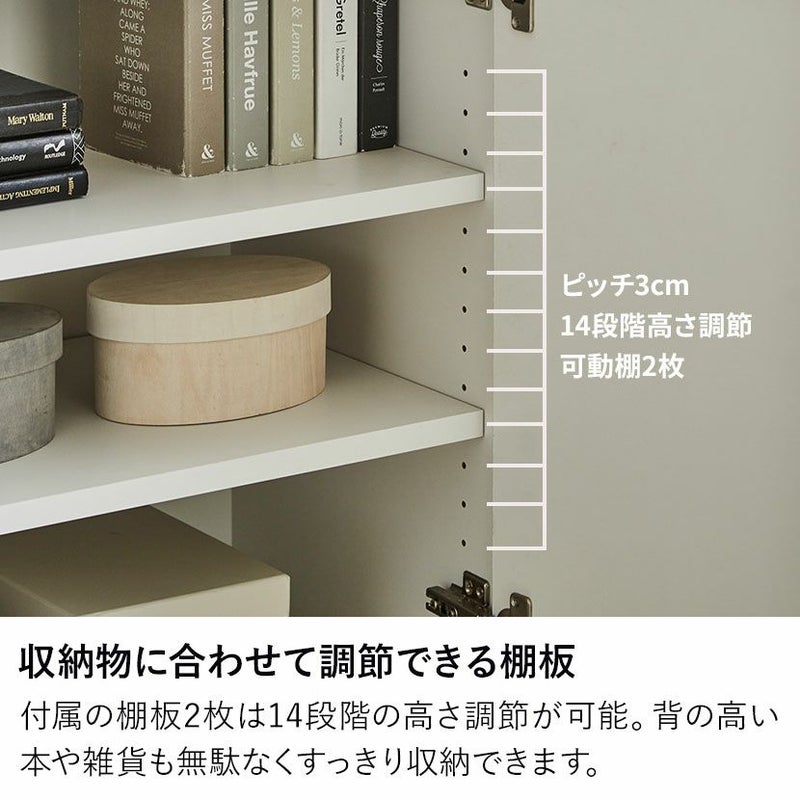 開き扉内には、2枚の棚板が付属しており、しまう物に合わせて高さ調節が可能です。