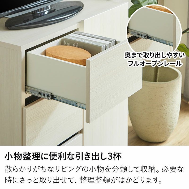 リビング周りの小物整理に役立つ引き出しを3杯備えています。