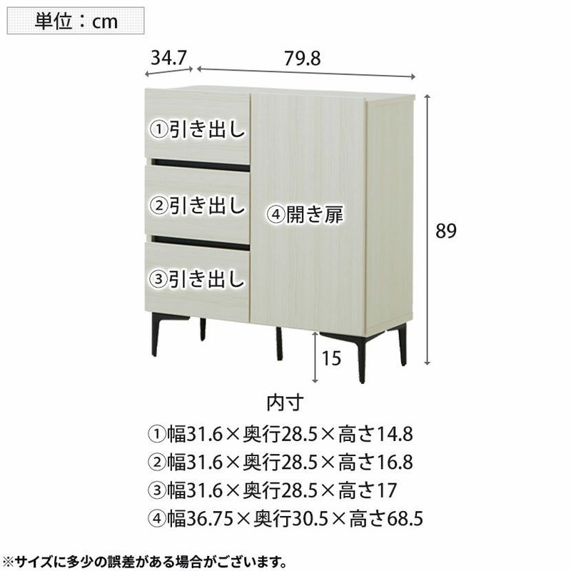 開き扉内には、3枚の棚板が付属しており、しまう物に合わせて高さ調節が可能です。