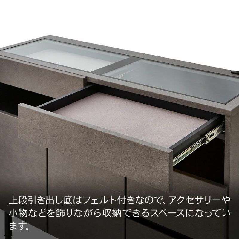 ショーケースのようなディスプレイ収納と、隠す収納ができるサイドボードです。