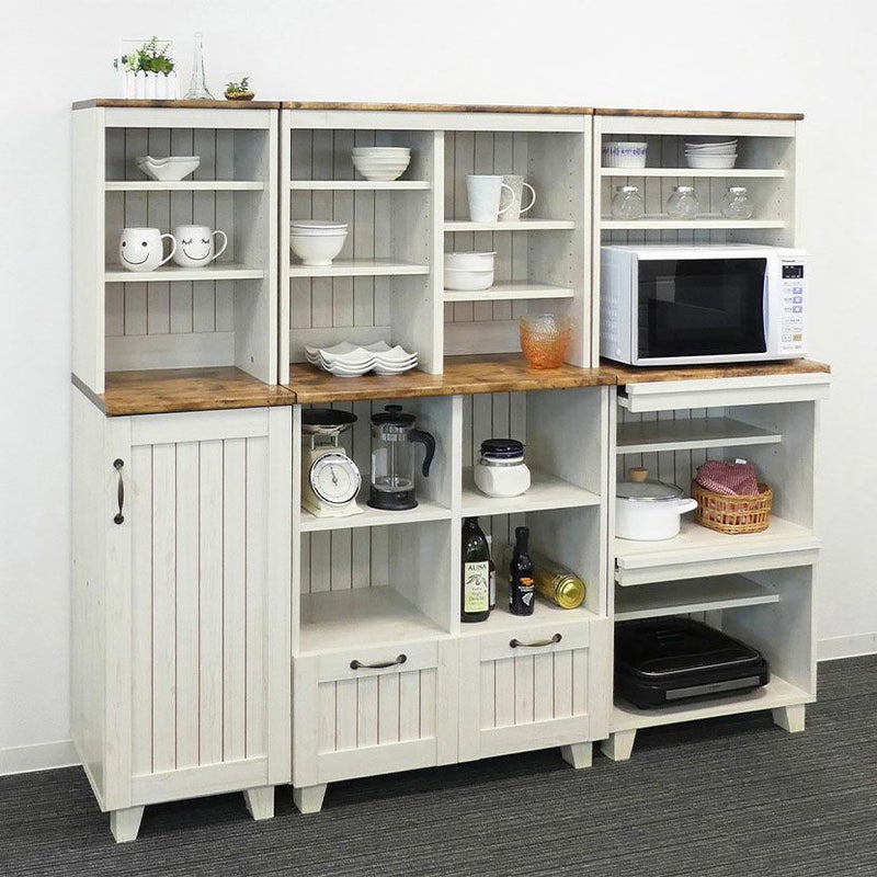 上段は全てオープン仕様なので、よく使う物を置いたり、飾り棚として見せる収納を楽しめます。(可動棚付き)