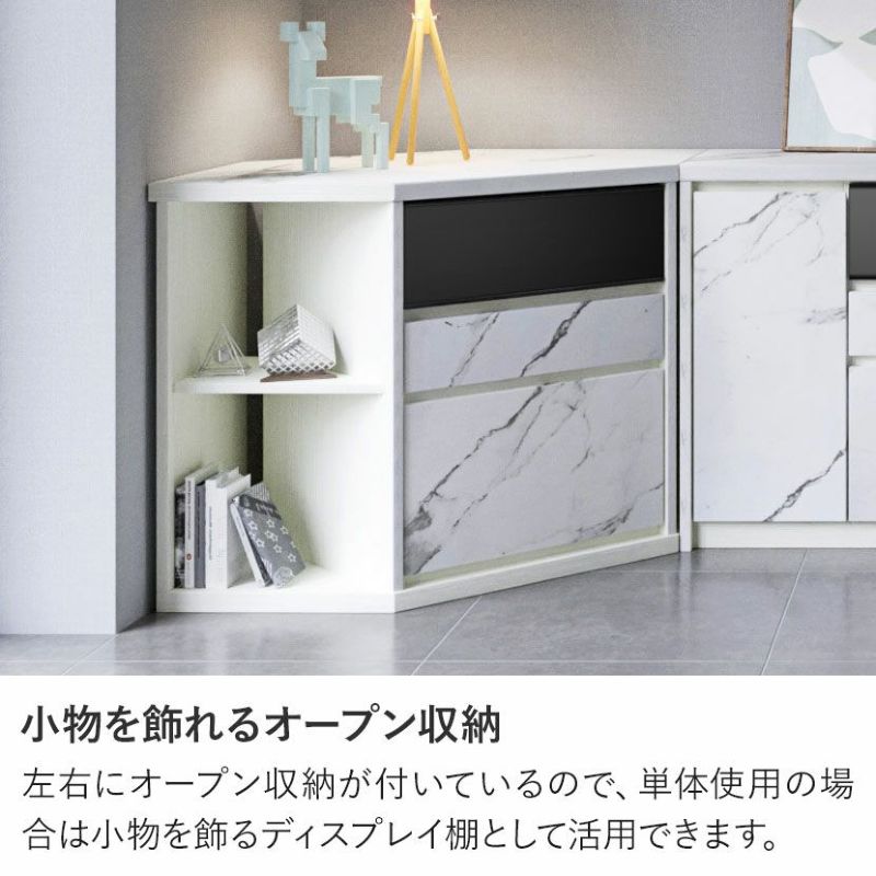 左右にオープン収納が付いているので、単体使用の場合は小物を飾るディスプレイ棚として活用できます。飾るものに合わせて高さを変えられる可動棚です。