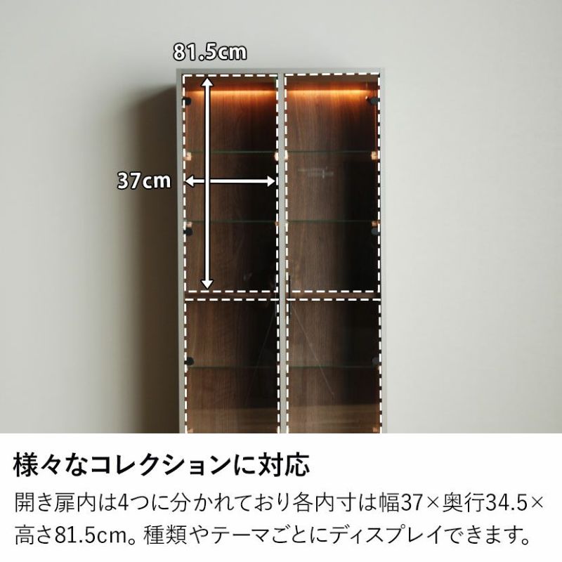 開き扉内は4つに分かれており各内寸は幅37×奥行34.5×高さ81.5cm。種類やテーマごとにディスプレイできます。