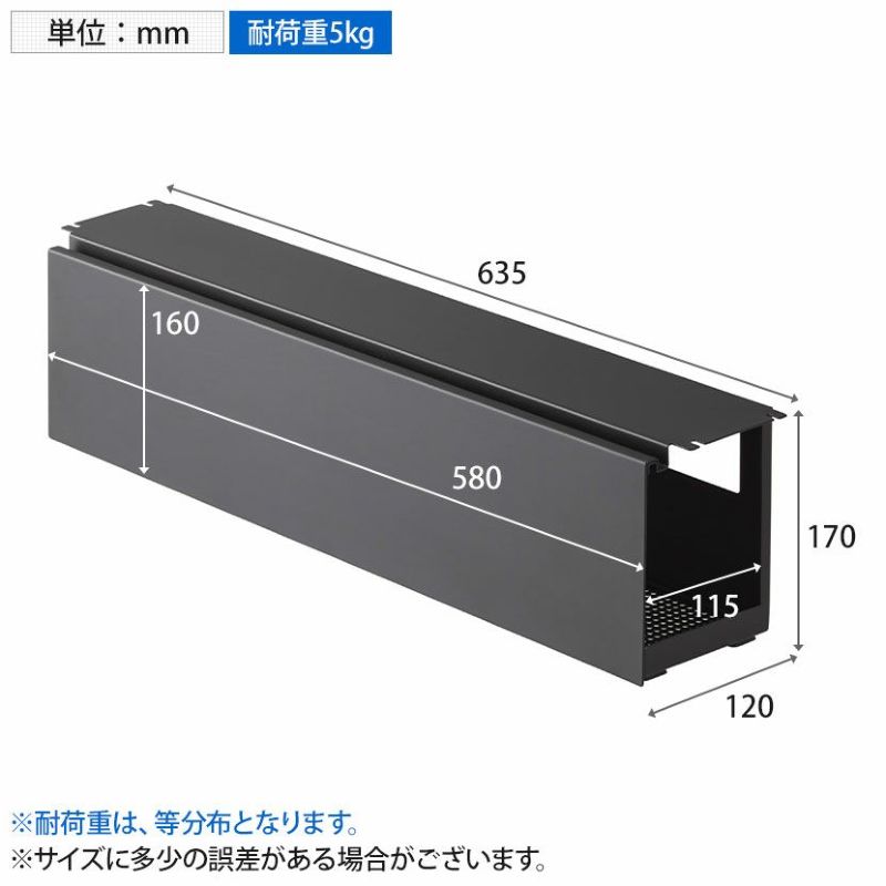 | サイズ | 外寸 / 幅635×奥行120×高さ170mm 内寸 / 幅578×奥行115×高さ168mm コード抜け穴(1箇所あたり) / 幅64×高さ70mm |
