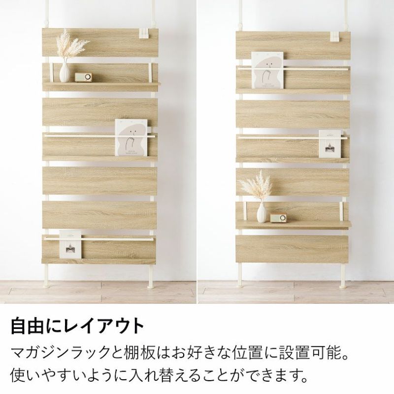 マガジンラックと棚板はお好きな位置に設置可能。使いやすいように入れ替えることができます。