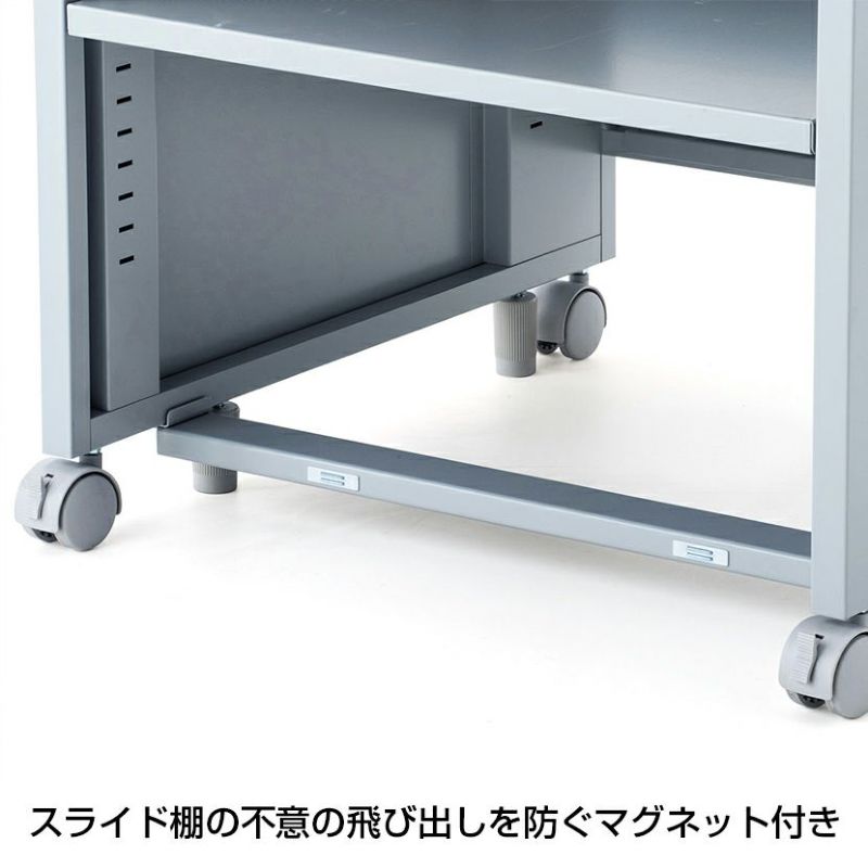 下棚はスライド棚になっており、高耐荷重100kgタイプなので、プリンター以外にUPSや検査機などの重量物の設置が可能です。