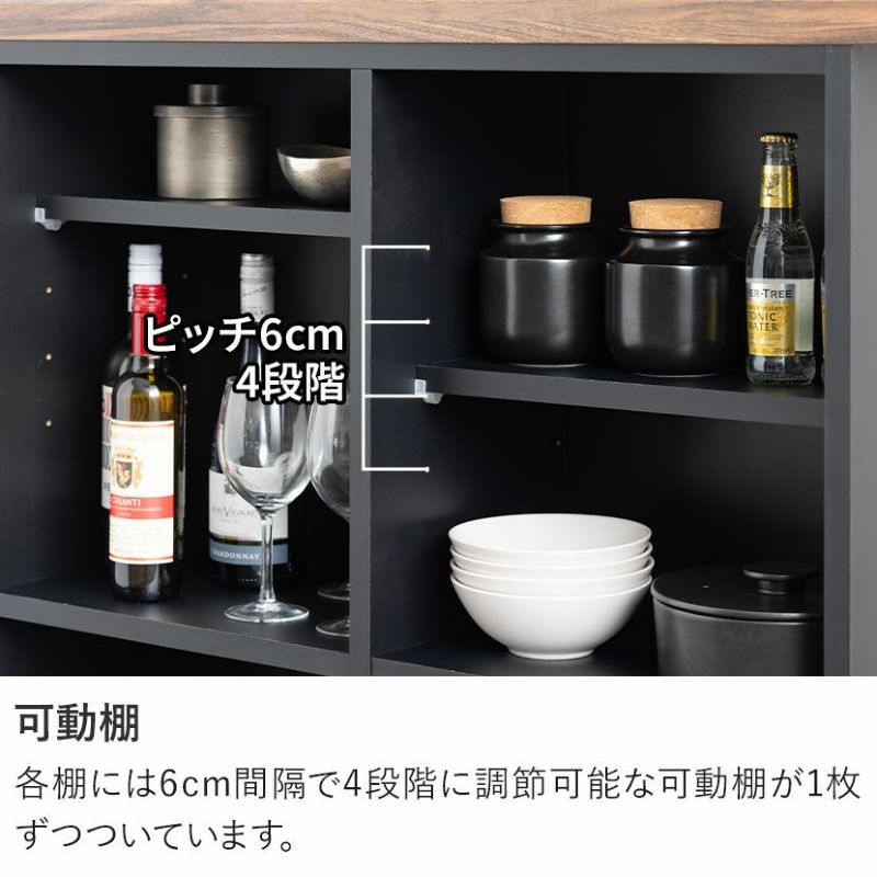 各棚には6cm間隔で4段階に調節可能な可動棚が1枚ずつついています。