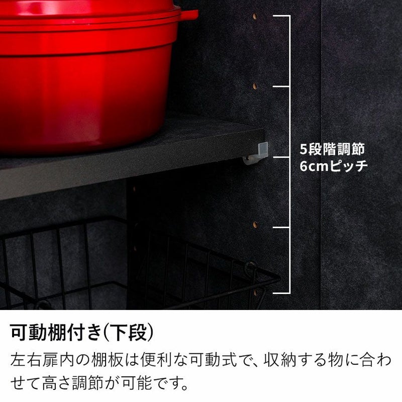 扉内の棚板は便利な可動式で、収納する物に合わせて高さ調節が可能です。