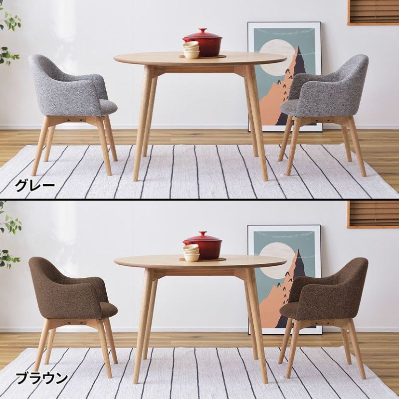 2人用 ダイニングテーブル セット 3点 丸テーブル 回転チェア ファブリック 肘付き 天然木 北欧風 ナチュラル おしゃれ (幅110cm 木製 円形テーブル×1 回転椅子×2)