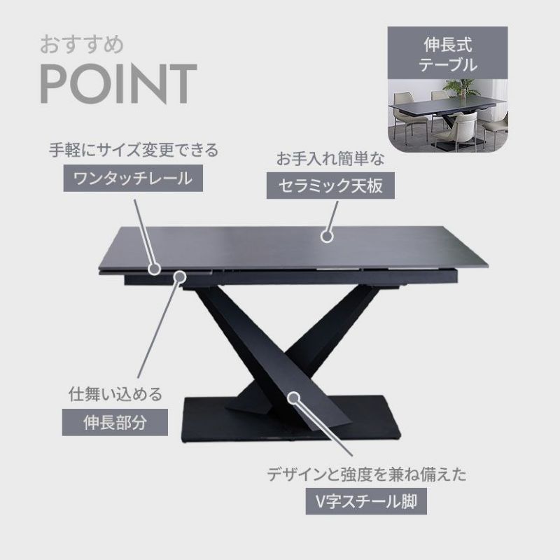 モダンで個性的なV字の脚と、利便性の高い伸長機能を備えたダイニングテーブルです。