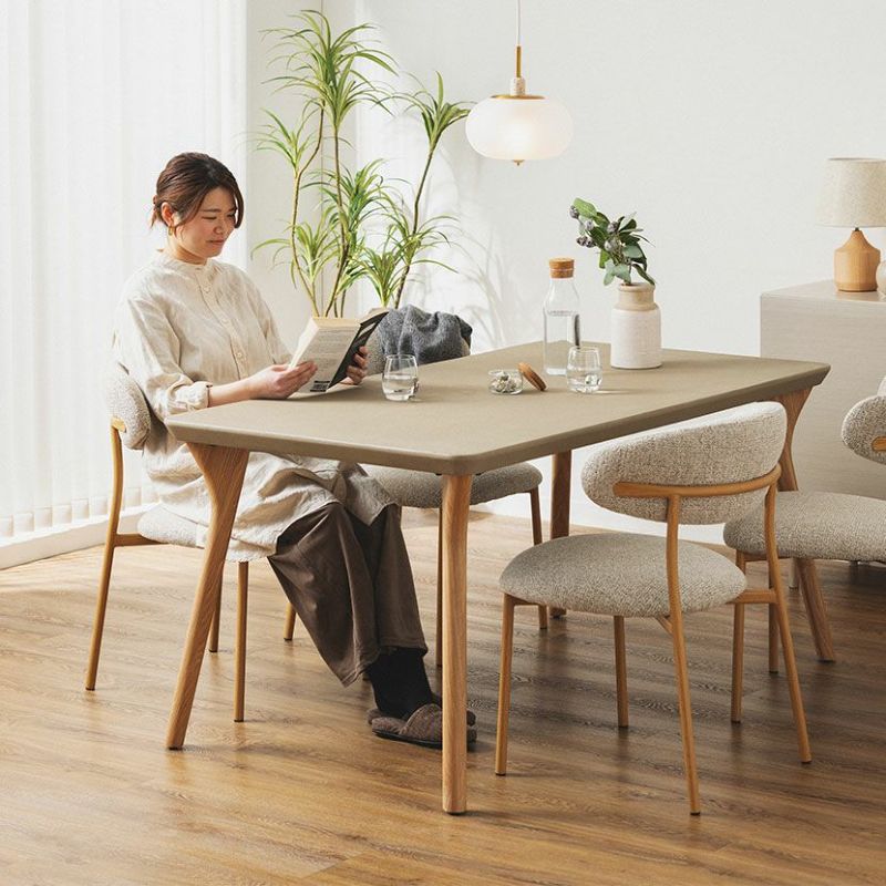 重厚感のあるモルタル天板と、あたたかみのある木脚を組み合わせた、異素材のダイニングテーブルです。