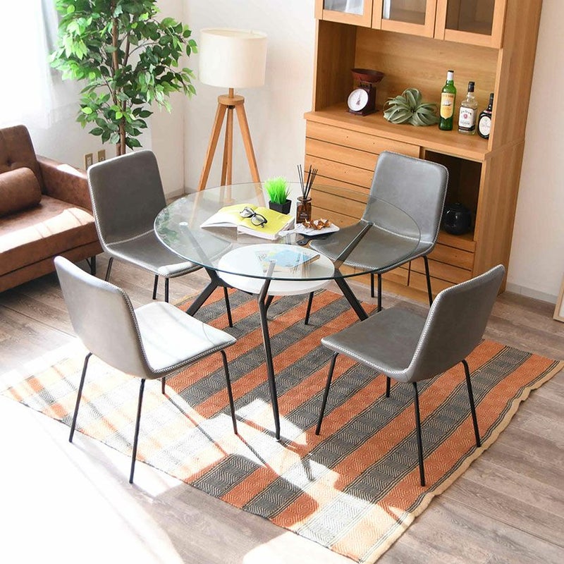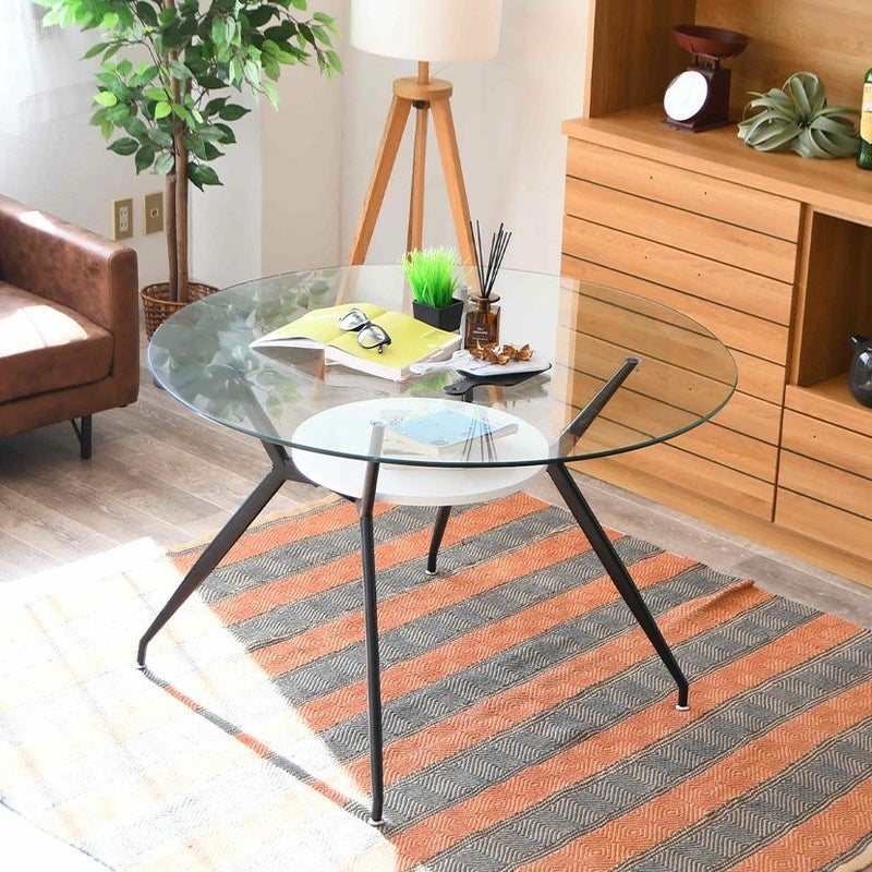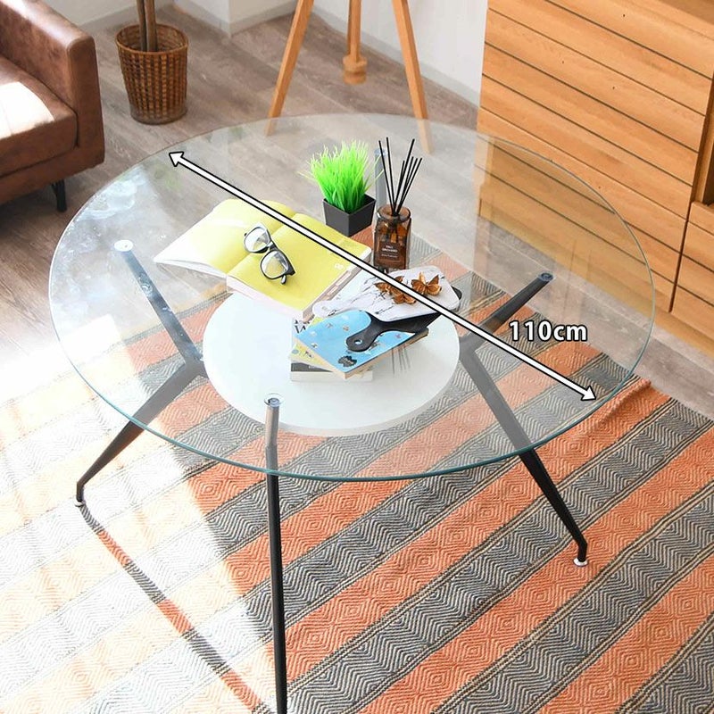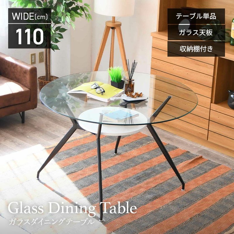幅110cm ガラス ダイニングテーブル スチール脚 ガラス天板 円形 テーブル 4人用 食卓テーブル 収納 棚付き ガラステーブル カフェテーブル 丸テーブル おしゃれ シンプル モダン