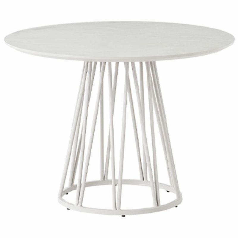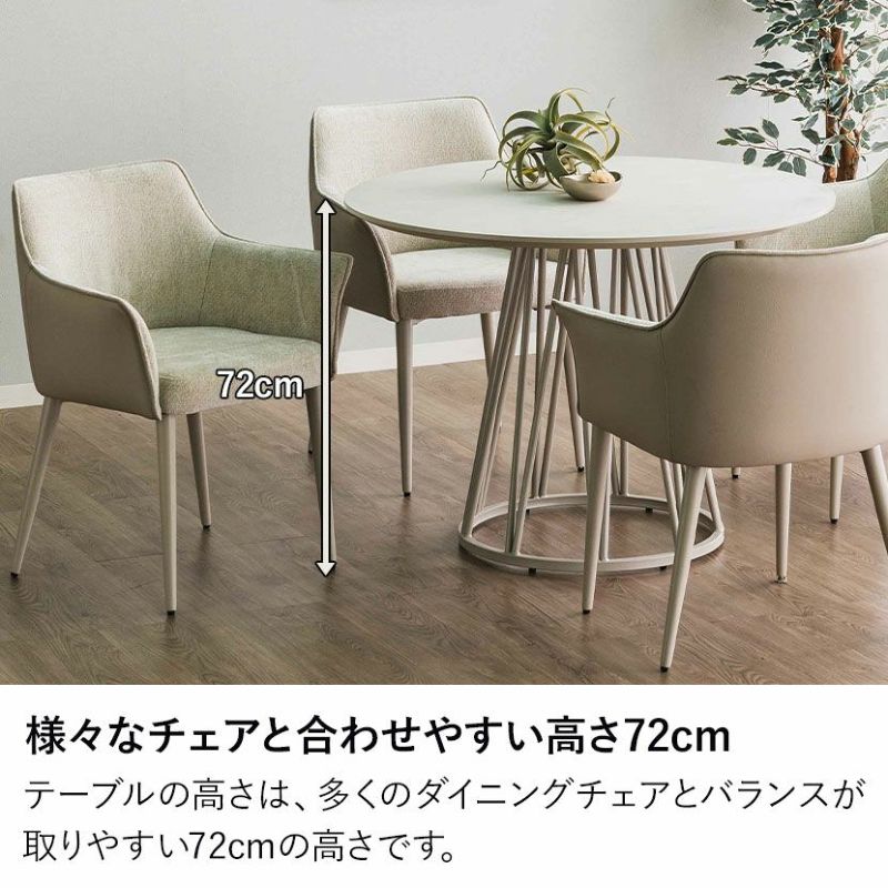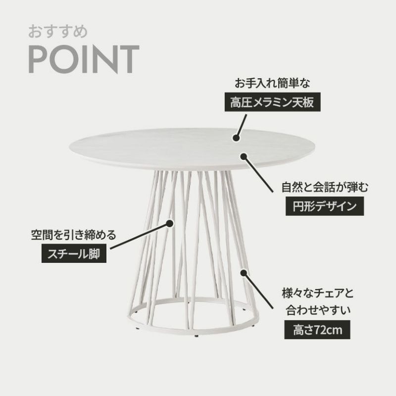 細身のスチール脚が、円形天板のやわらかな印象を引き締め、モダンな雰囲気を演出します。