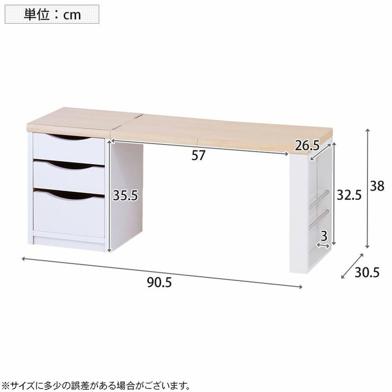 | サイズ | 外寸 / 幅905×奥行305×高さ380mm 折りたたみ時 / 幅340×奥行305×高さ430mm 引き出し内寸(小) / 幅220×奥行265×高さ65mm 引き出し内寸(大) / 幅220×奥行265×高さ100mm |