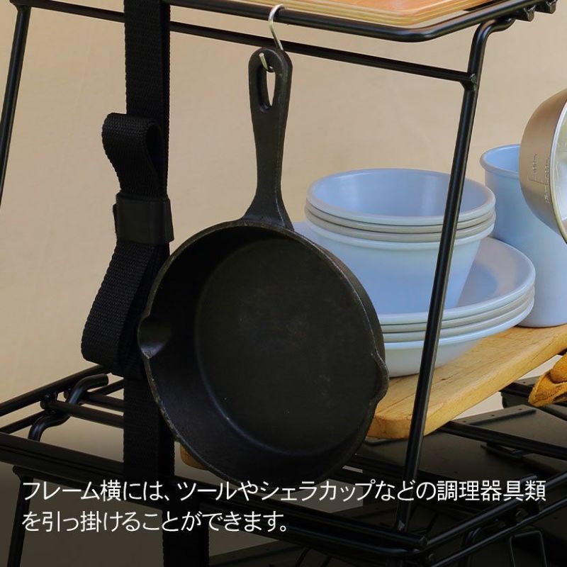 ●フレーム横には、ツールやシェラカップなどの調理器具類を引っ掛けることができます。